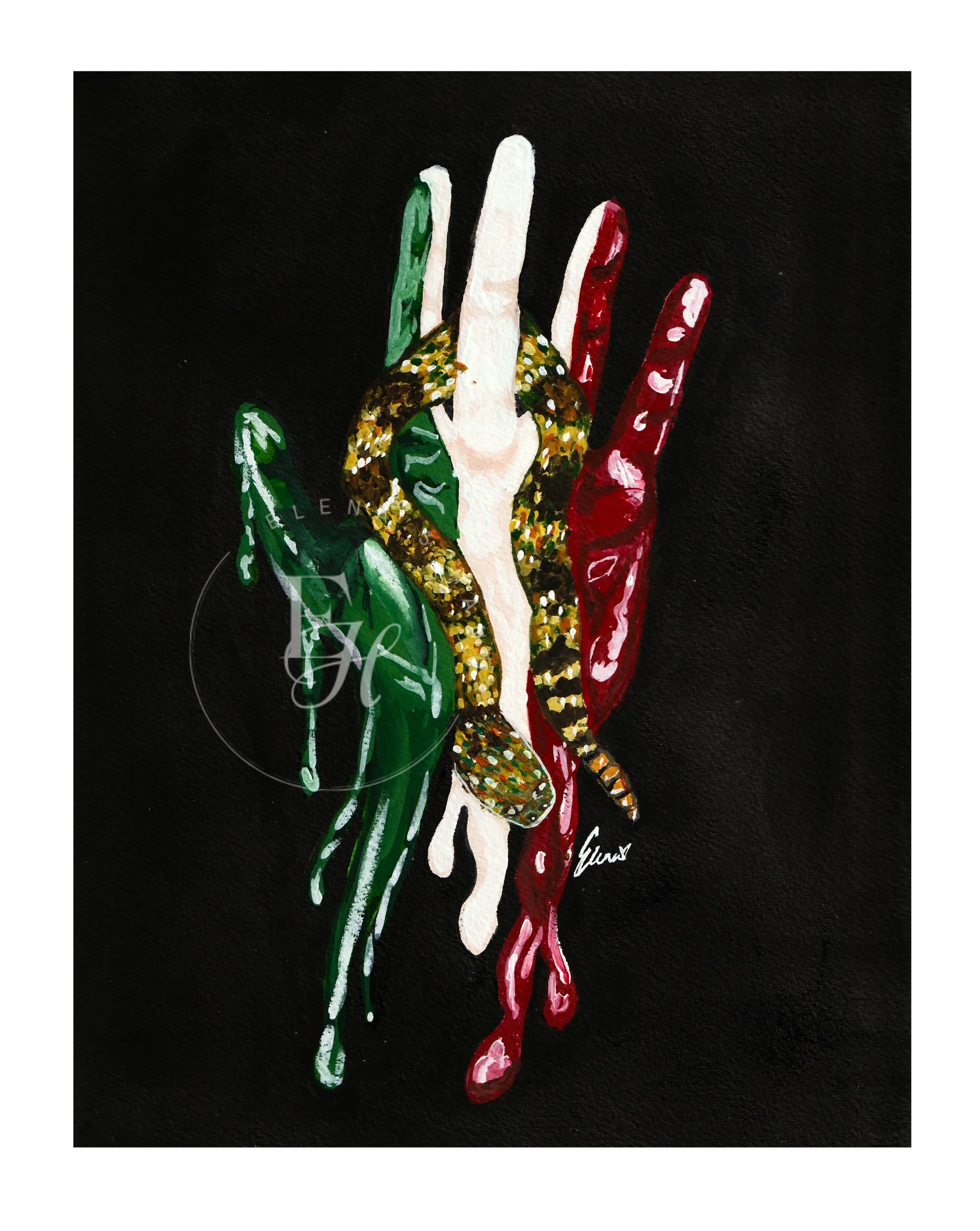 Limited print of the first EH art piece! Representing Mexico, strength, and resilience. This piece is not only special because of artists’ roots, but she was bitten by a rattlesnake and thus the snake was symbolized instead of the bird.